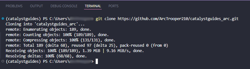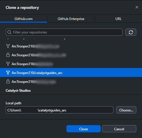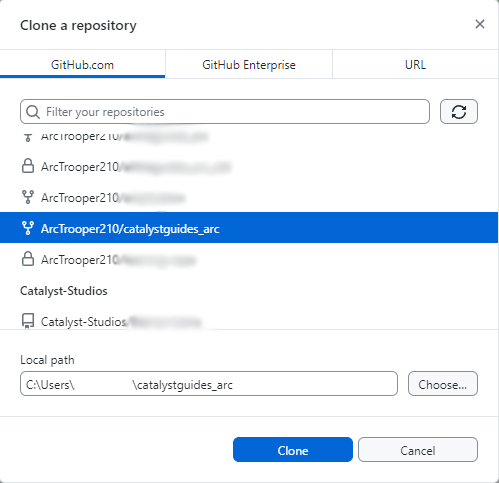 Go to File Clone repository... OR do Ctrl+Shift+O and select your Catalyst Guides fork. (I put _arc for my own sorting purposes)