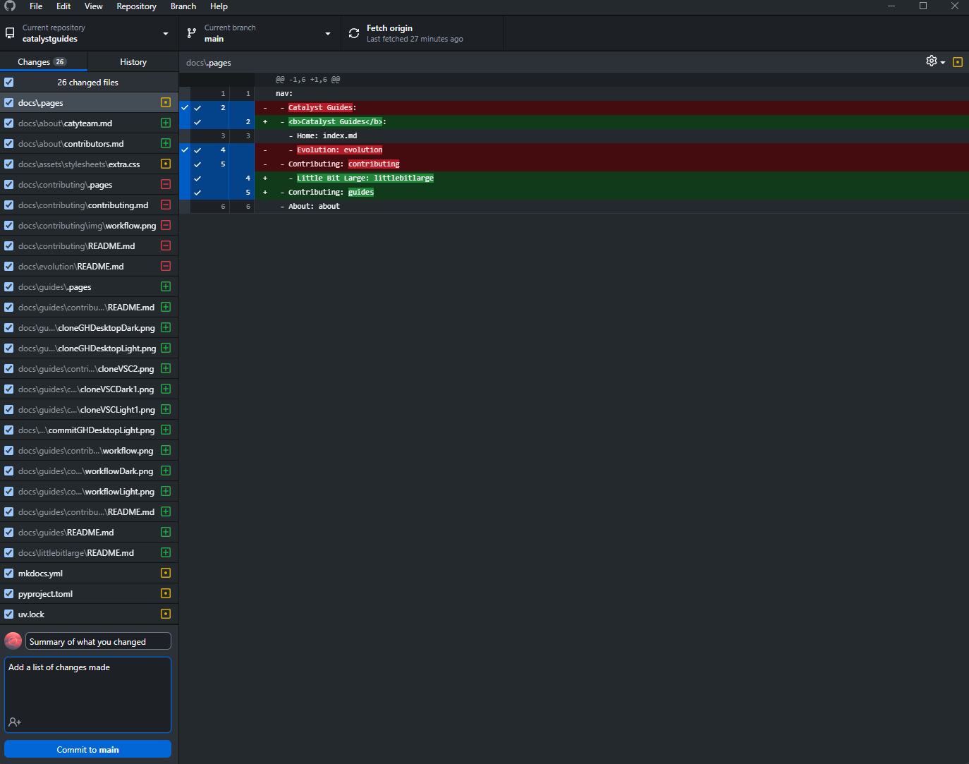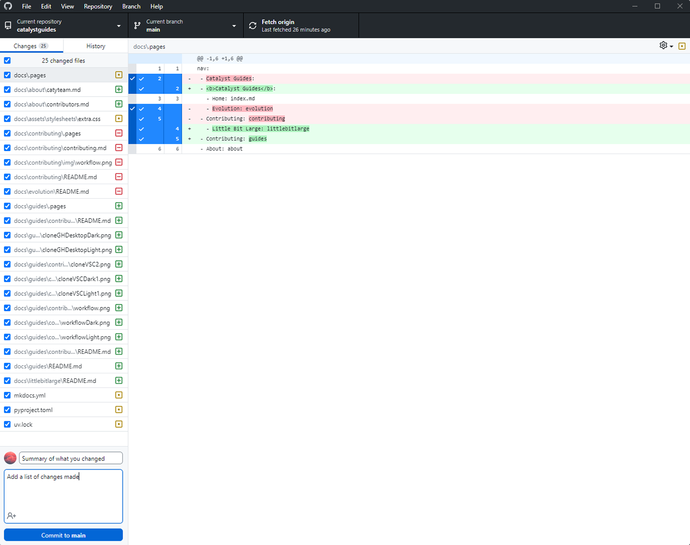 Commiting sends your changes to your fork of Catalyst Guides on GitHub. From there you can then submit a Pull Request.