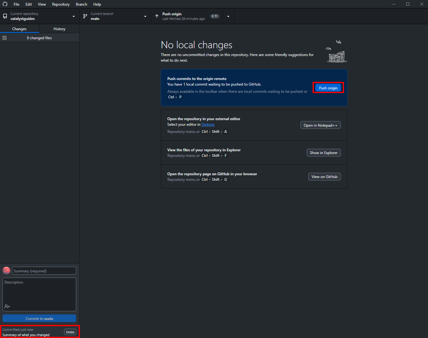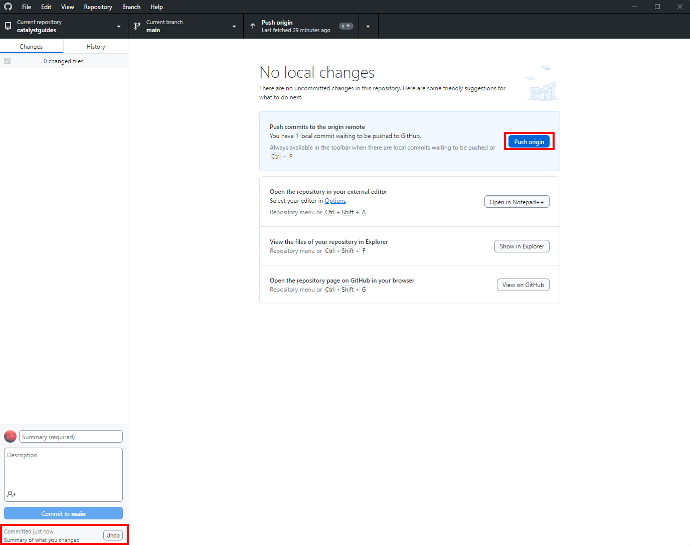 SummaryandDescriptionon the bottom left, clickCommit to mainwhen you're ready to commit. - If you made a mistake, you can undo the commit in the bottom left. Otherwise click
