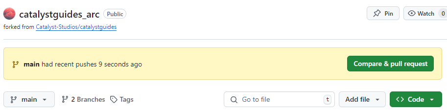 After making your Commit, go to your fork of Catalyst Guides on GitHub and you'll see a yellow banner with a button that says Compare & pull request.